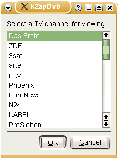 In KDE you can use the mouse to copy menu entries by drag-and-drop mechanism to the Desktop. If you now click the ZapDvb: Viewer entry you get a channel list on your screen: